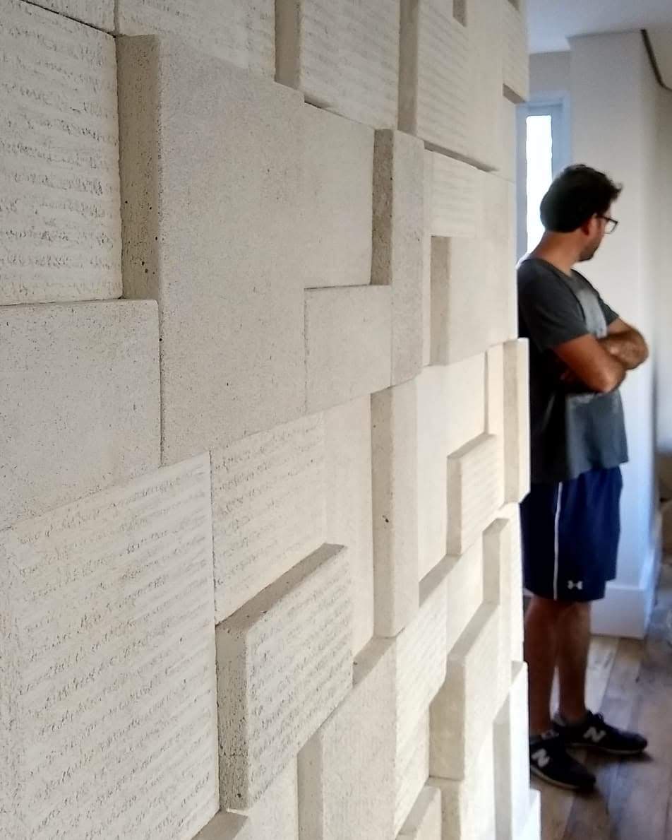 Artwall for the hall – Parede “Dupla Face” criada em concreto leve para separar o hall de elevador da sala de estar neste belo apê dos amigos queridos.