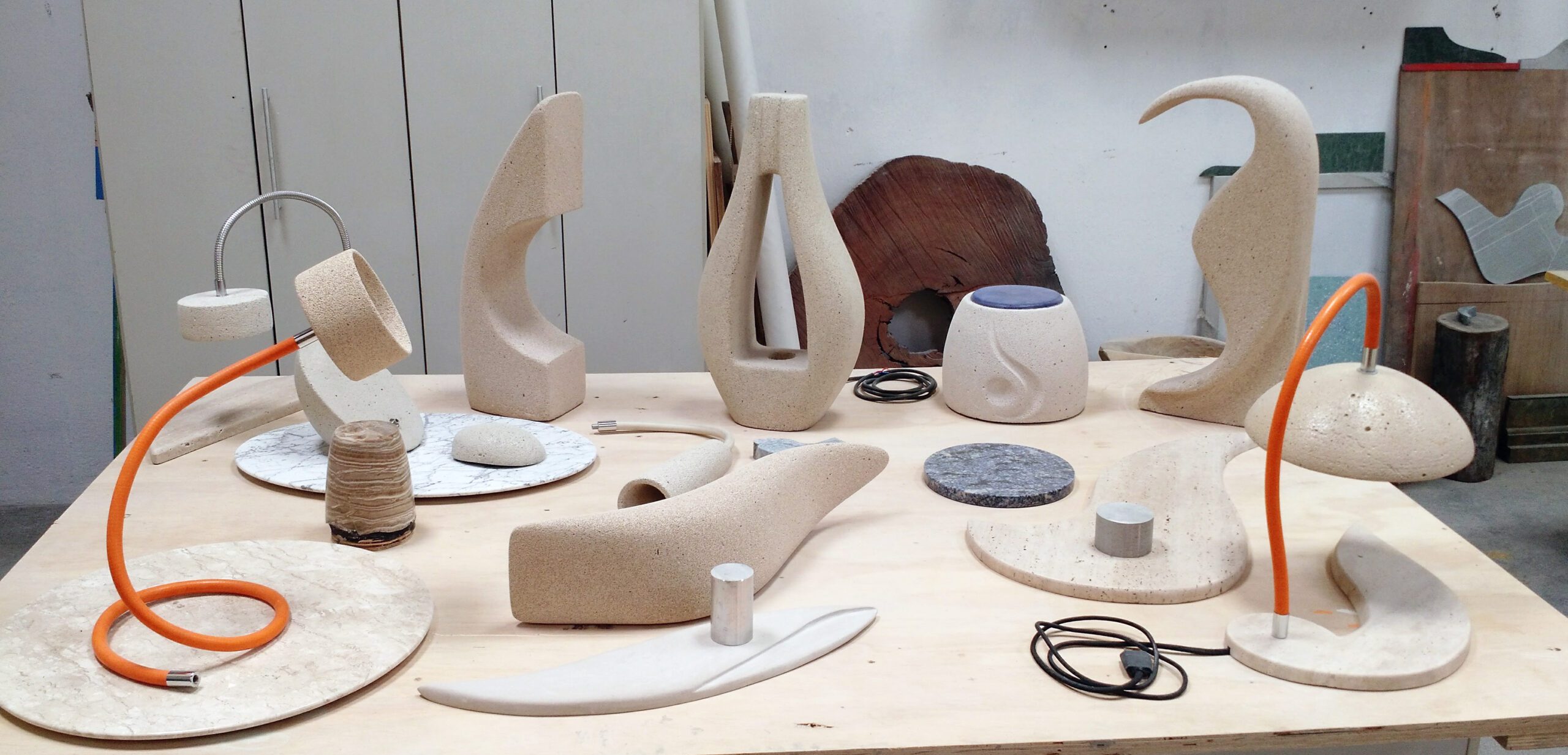 As luminárias surgiram meio que por acaso quando criava um painel em cimento. Há muito que queria incorporar iluminação às esculturas e ao trabalhar com concreto, me apaixonei pela facilidade de esculpir o material. Nos meses seguintes desenvolvi um sistema para criar peças únicas em formatos diversos sem utilização de moldes.