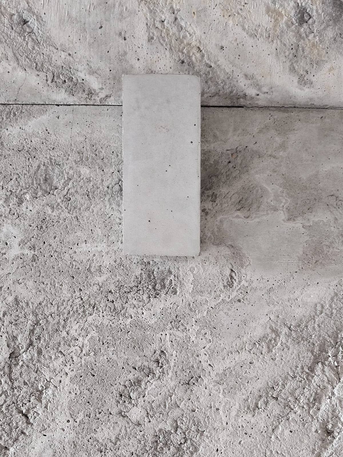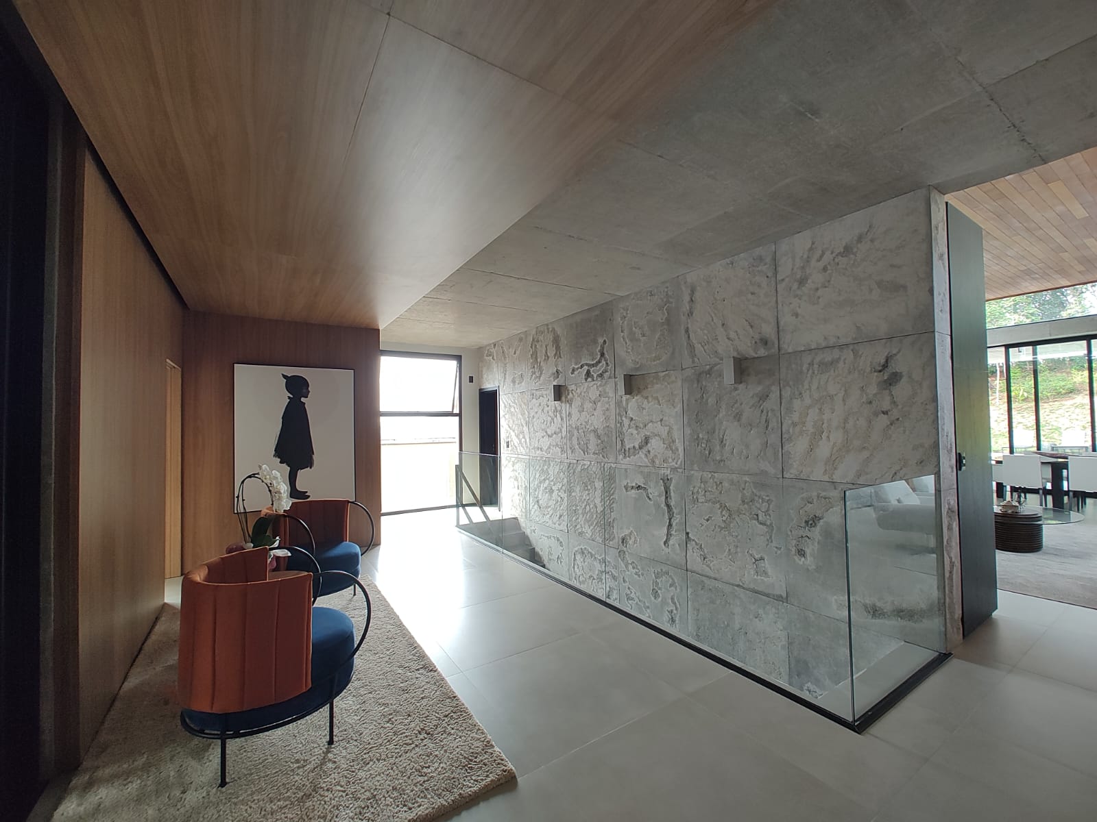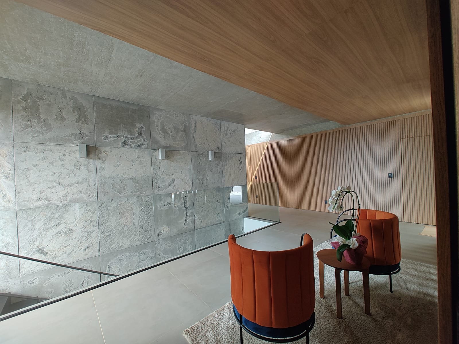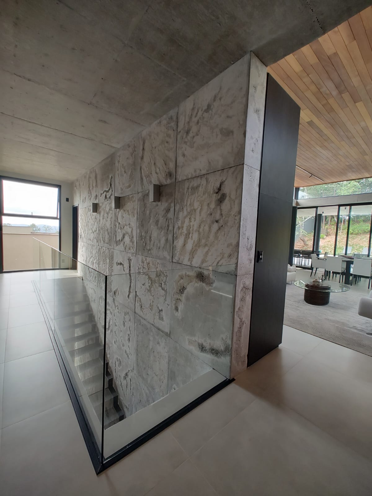 Para a parede da escada com pé direito duplo no interior da residência, desenvolvemos à pedido da proprietária, um acabamento rústico para as placas de 100 x 100 e criamos também três luminárias arandelas em concreto na mesma cor do revestimento!